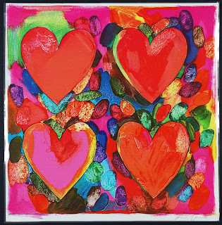 Additional ideas you may want to bring out in your discussion: Artists use color and subjects to express their ideas, just like how writers use words, or dancers use their bodies. Jim Dine has been painting and sculpting hearts over and over for years. What do you think he's trying to say by using the symbol of a heart in his works? What is a symbol? (an object that stands for an idea). What's the effect of showing the same symbol over and over? (...which is called repetition)